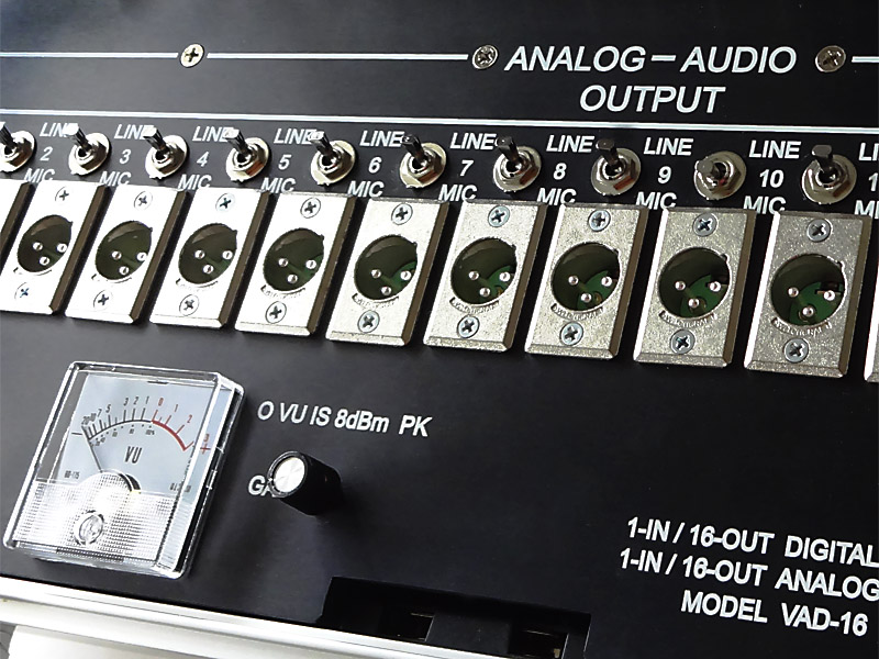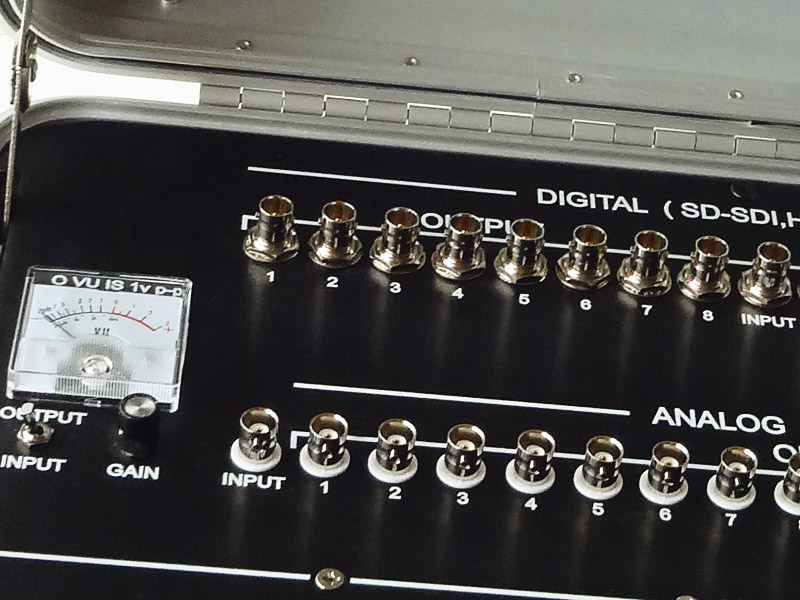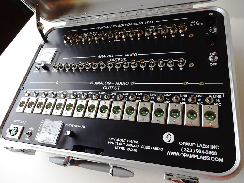 The Model VAD-16 1-in/16-out Audio/Video High Definition Distribution Press Box is useful as a hi def network feed, for courtrooms, sporting events, concerts, etc. for up to 16 monitors, recorders, and amplifiers per section. It can handle both analog and digital signals. The Digital section is compatible with SD-SDI, HD-SGI, 3G-SDI signals.