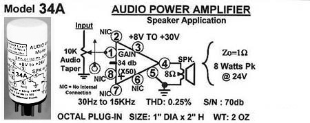 The Model 34A Audio Power Amplifier is for powering Speakers. It is a single polarity power supply Logic Module covered by an MU metal can with an Octal plug-in.